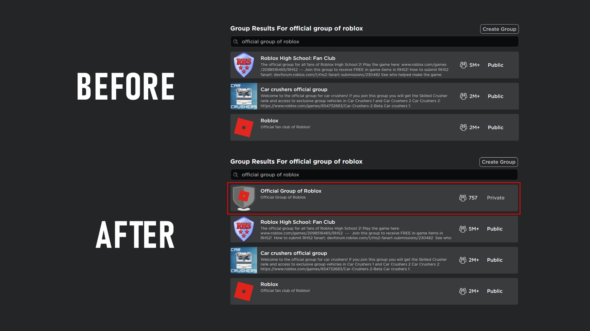 Bloxy News On Twitter Searching For A Group On Roblox Is Now More Reliable Now When Searching For A Term The Group With That Exact Name Will Appear At The Top